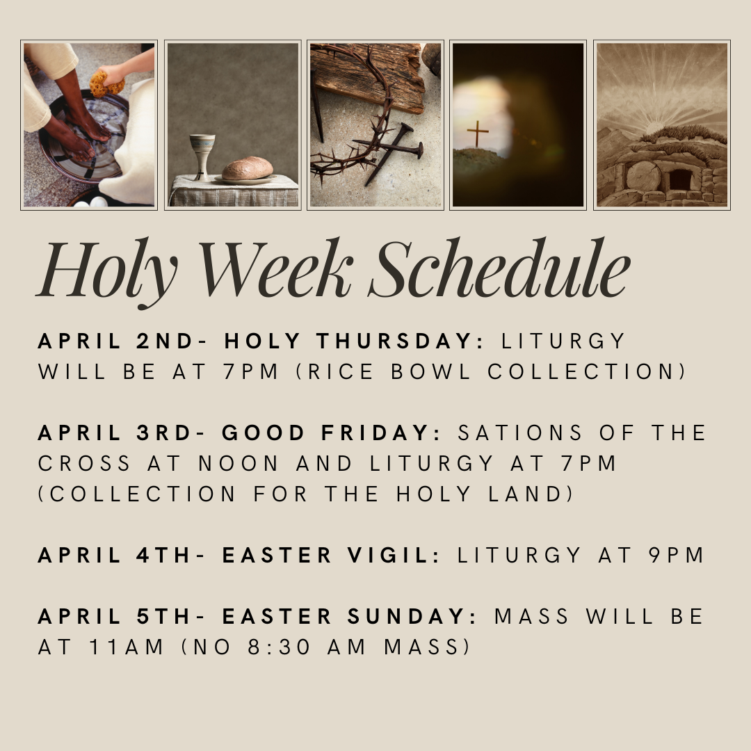 Stations of the Cross are on Friday’s during Lent at 6:00 p.m. in the Church.