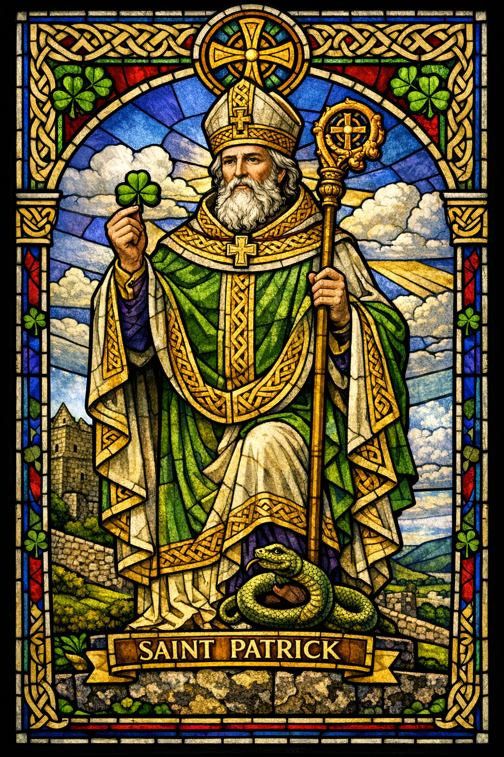Saint Patrick Parish, Salt Lake City takes its name from the great saint born in approximately 385 A.D. His life began in Britain which was then under the rule of the crumbling Roman Empire. When Patrick was sixteen, he was kidnapped by Irish pirates who were among the invaders often attacking his homeland. He served as a slave in Ireland for six years before escaping to France. There he studied to become a priest. By the year 432 A.D. he had been named a bishop and was sent back to Ireland, where he worked for thirty years. It is said that he baptized 120,000 people and helped introduce the Latin language to Ireland. The symbol of Saint Patrick is the shamrock that he used to teach the doctrine of the Holy Trinity.